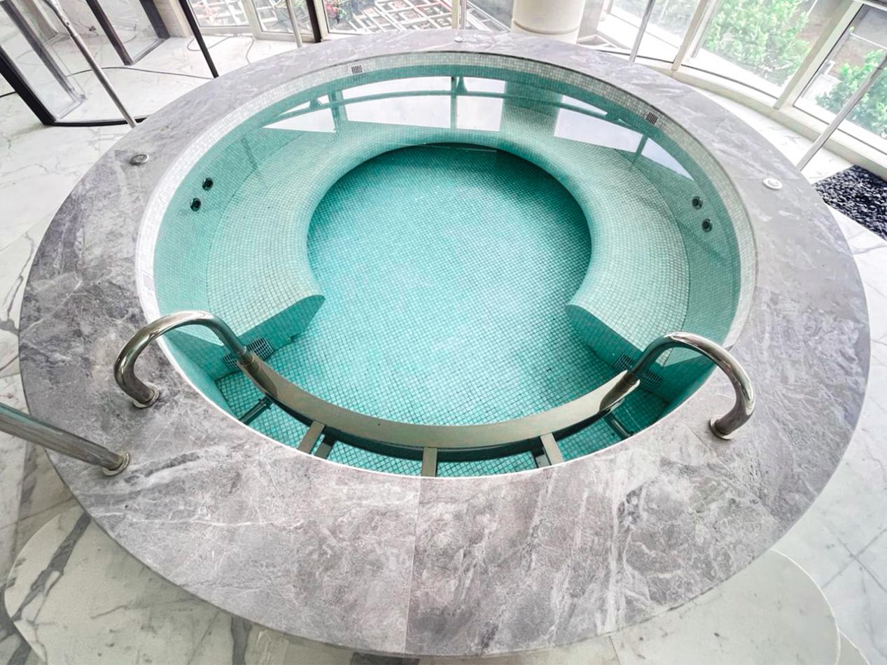 池岸区铺陈天然大理石,池壁与池底则以贝壳马赛克细密拼贴。每一块石材的遴选,每一道缝隙的对齐,皆经手工匠人的反复校准。微光掠过,马赛克表面泛起珍珠般的柔润光泽,与江面的粼粼波光遥相呼应。这种对材质的苛求,不仅关乎视觉的层次,更是对触感与安全的深度考量——防滑、亲肤、历久弥新。最终,泳池化为华尔道夫与自然对话的界面:水境无界延伸,光线在其上游移,江畔的绿意与城市的繁华在此交融,构筑一处都市中的静谧绿洲。