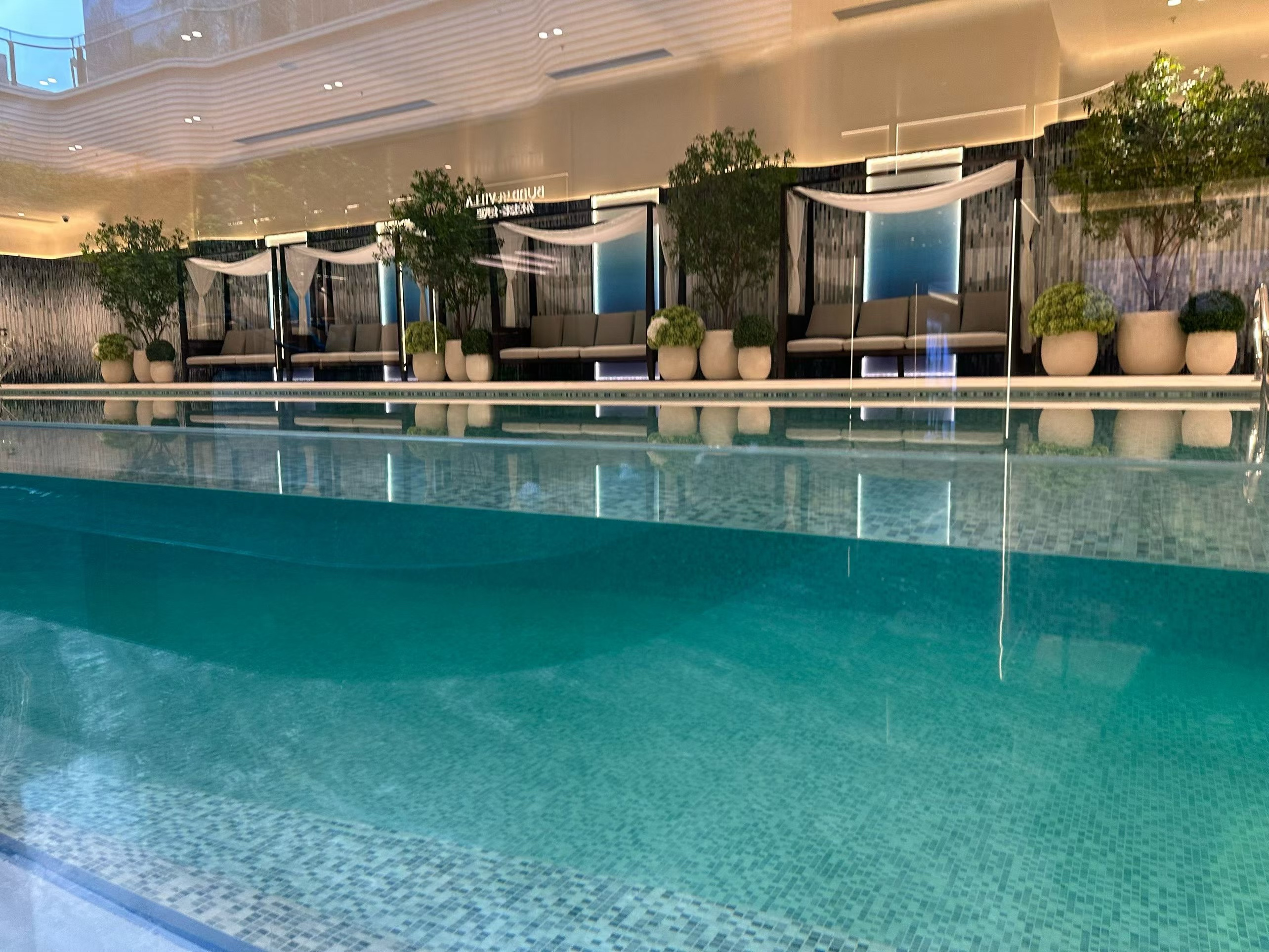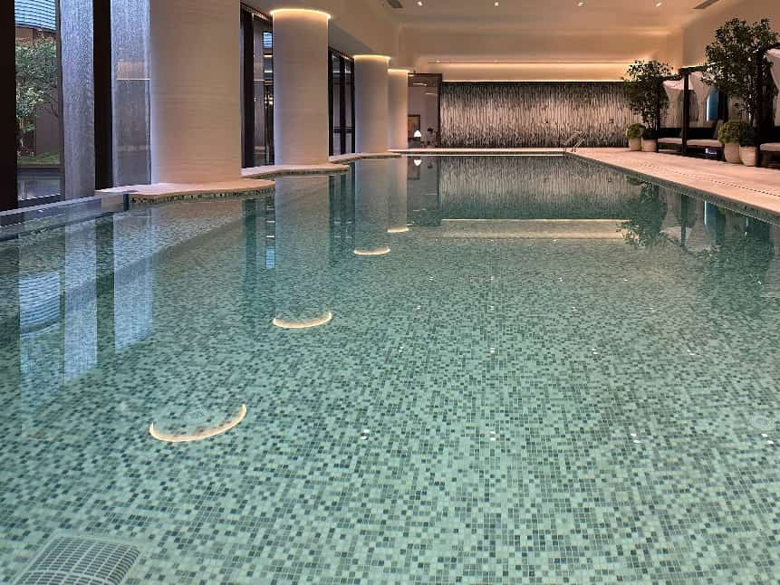 这一座25米的室内恒温泳池深藏于社区下沉式庭院会所之中,借由景观水帘、艺术花园与摩登水景围合,隔绝了城市喧嚣,自成一方静谧天地。在这里,游泳不再是简单的运动,而是归家即享的私属仪式感;通透的玻璃幕墙将庭院绿意引入室内,水波与光影交织,一步一景,尽显低调奢华。